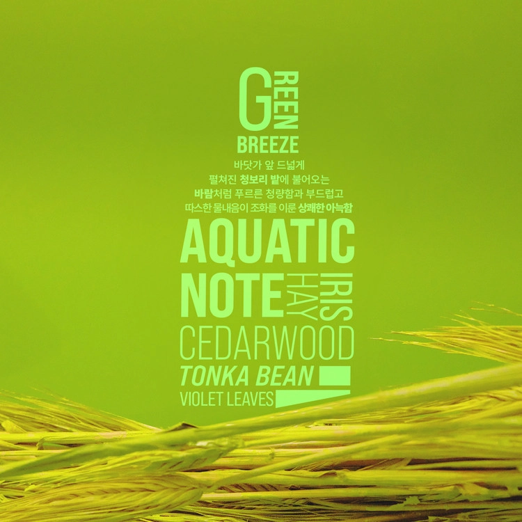 바닷가 앞 드넓게 펼쳐진 청보리 밭에 불어오는 바람처럼 푸르른 청량함과 부드럽고 따스한 물내음이 조화를 이뤄 상쾌한 아늑함을 전달합니다.