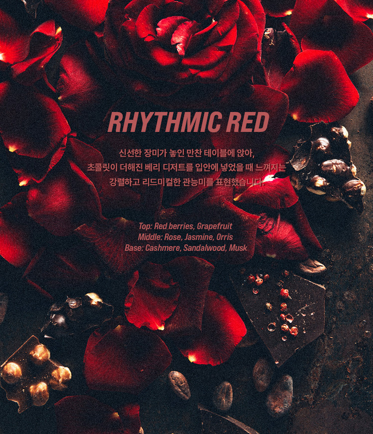 신선한 장미가 놓인 만찬 테이블에 앉아, 초콜릿이 더해진 베리 디저트를 입안에 넣었을 때 느껴지는 강렬하고 리드미컬한 관능미를 표현했습니다.